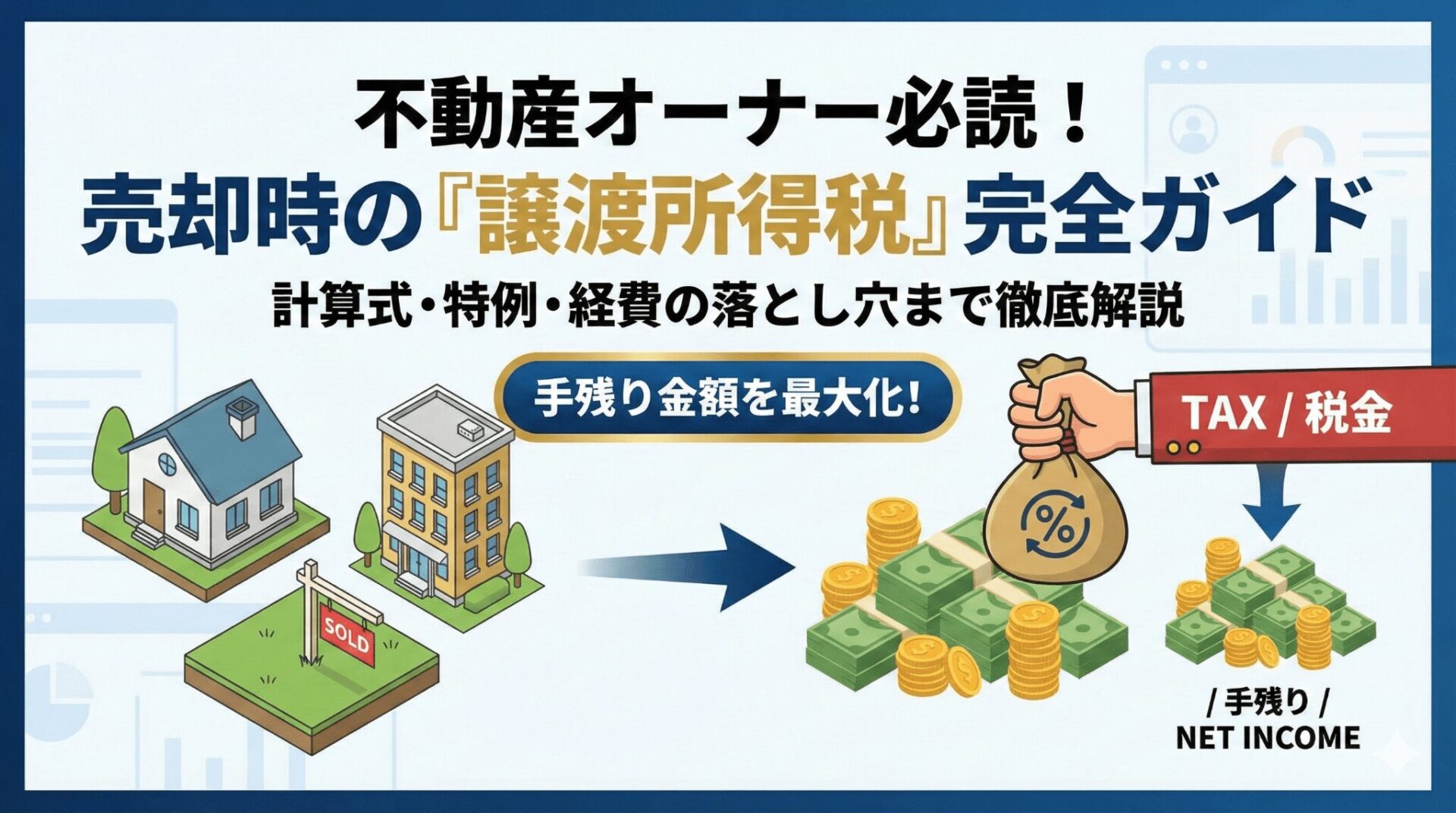 今回は、不動産オーナーが売却前に必ず頭に入れておくべき税金の知識を、計算の仕組みから税率、経費の範囲、そして節税に直結する特例まで、可能な限り具体的に網羅して解説します。